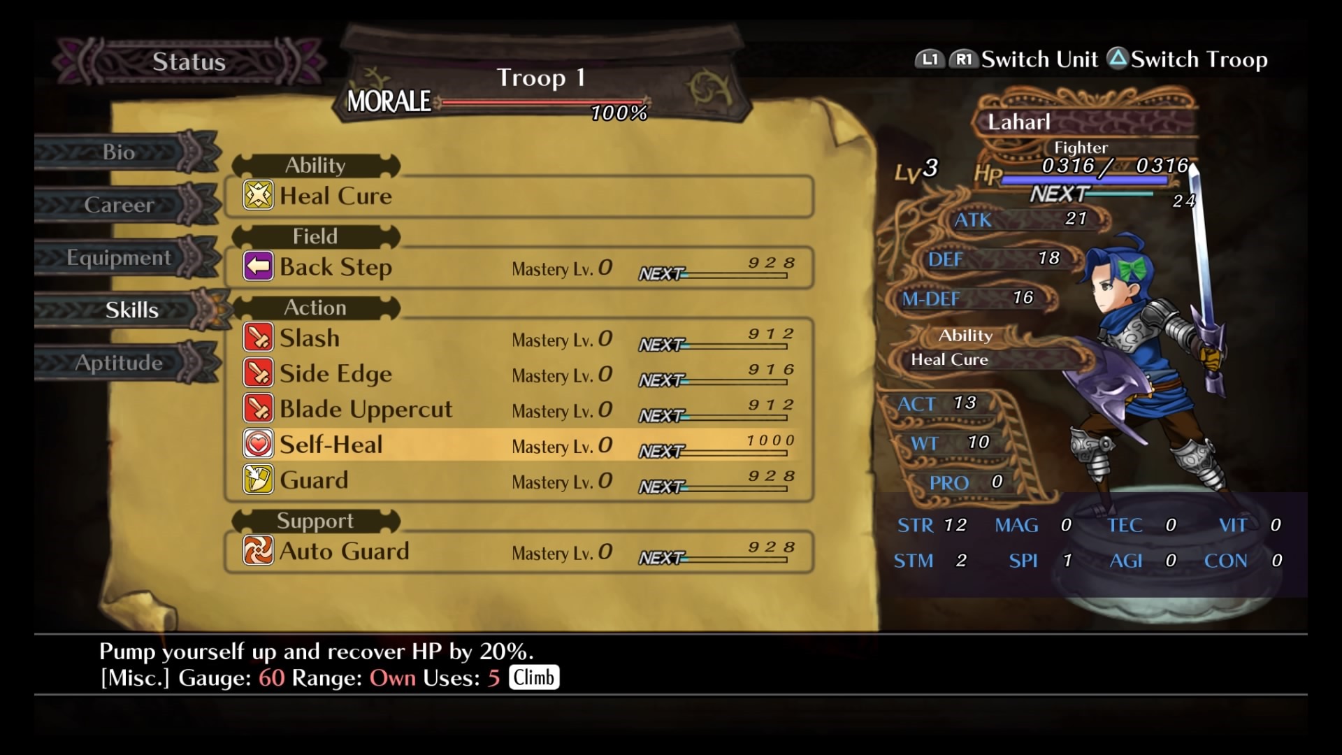 People will want to use their Fighter as a damage dealer and tank. He can guard at any time after moving and attacking, putting up a defensive front. This can be worn down, depending on how many action points he had when he assumed the guard stance. Seeing as how his Auto Guard stance kicks in after using up all his actions, this may not be very long. Of his attacks, I find Sword Pierce most helpful, as it deals 50% more damaged to ranged units and the Fighter can easily run up to those back-row units.