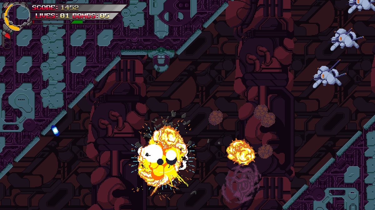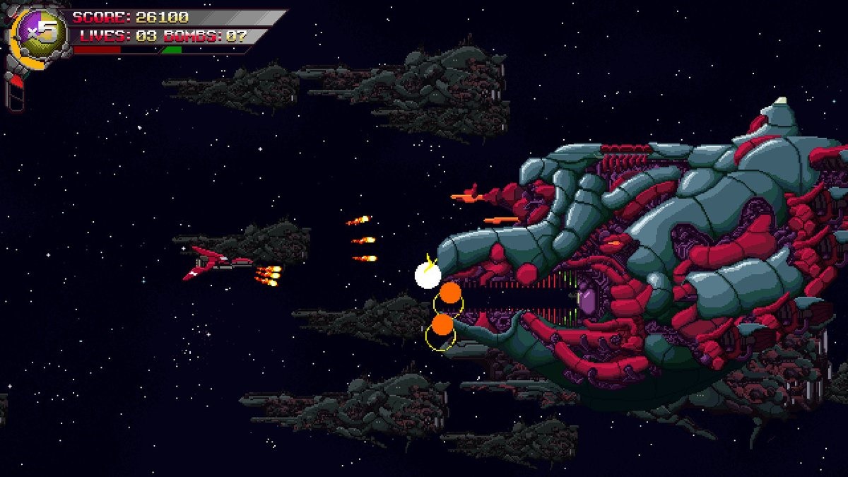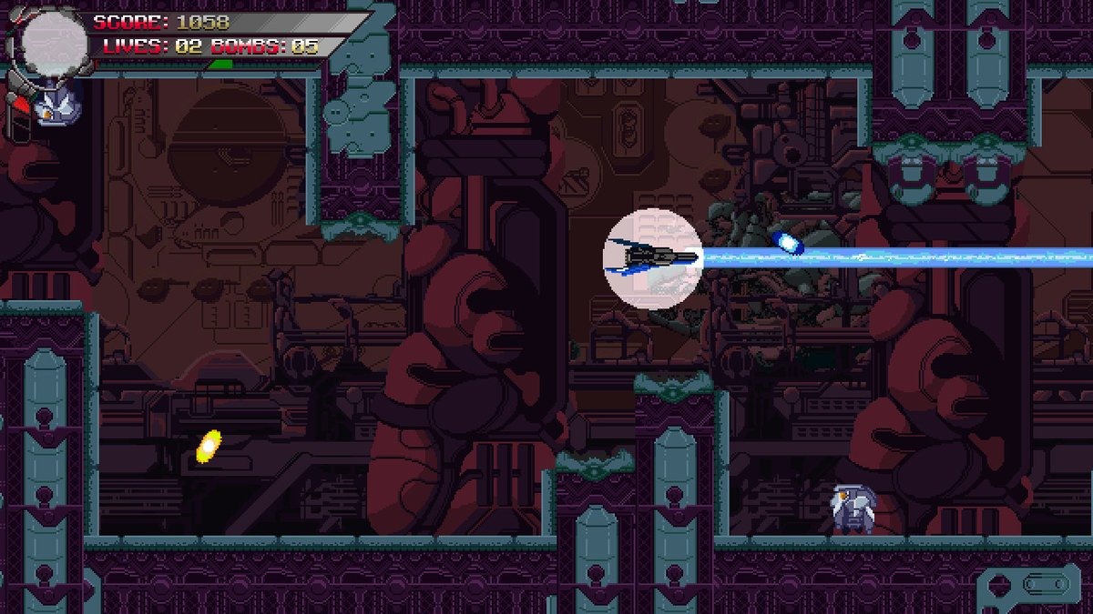 Devil Engine doesn’t hide the fact that it is inspired by the shmups of old, eschewing the ‘bullet hell’ format of gameplay for a more patterned variation of bullets that while hard to avoid, isn’t overwhelming. The game overall is difficult, no doubt, but at least it sends you back in immediately instead of sending you back to the checkpoint. What’s important to track are the options you have in the game. In Devil Engine, you have three different Shot types – Shotgun, Laser, and Homing, which can be individually upgraded if you collect the same type of Shot multiple times. As in other games, you can only have one at a time, so it’s better to stick with the best Shot for the situation you’re in, or the one you’re most comfortable with. For my case, I mostly stuck with Laser, which is the most powerful of the three, and Laser was also very effective against bosses and mini-bosses as well. Sometimes I would switch to Homing, especially during tight corridors where taking out mounted turrets just out of reach otherwise would determine life or death. Beware though, as dying drops your Shot power down one level, hindering you even further. However, using a Continue starts you off at max level.