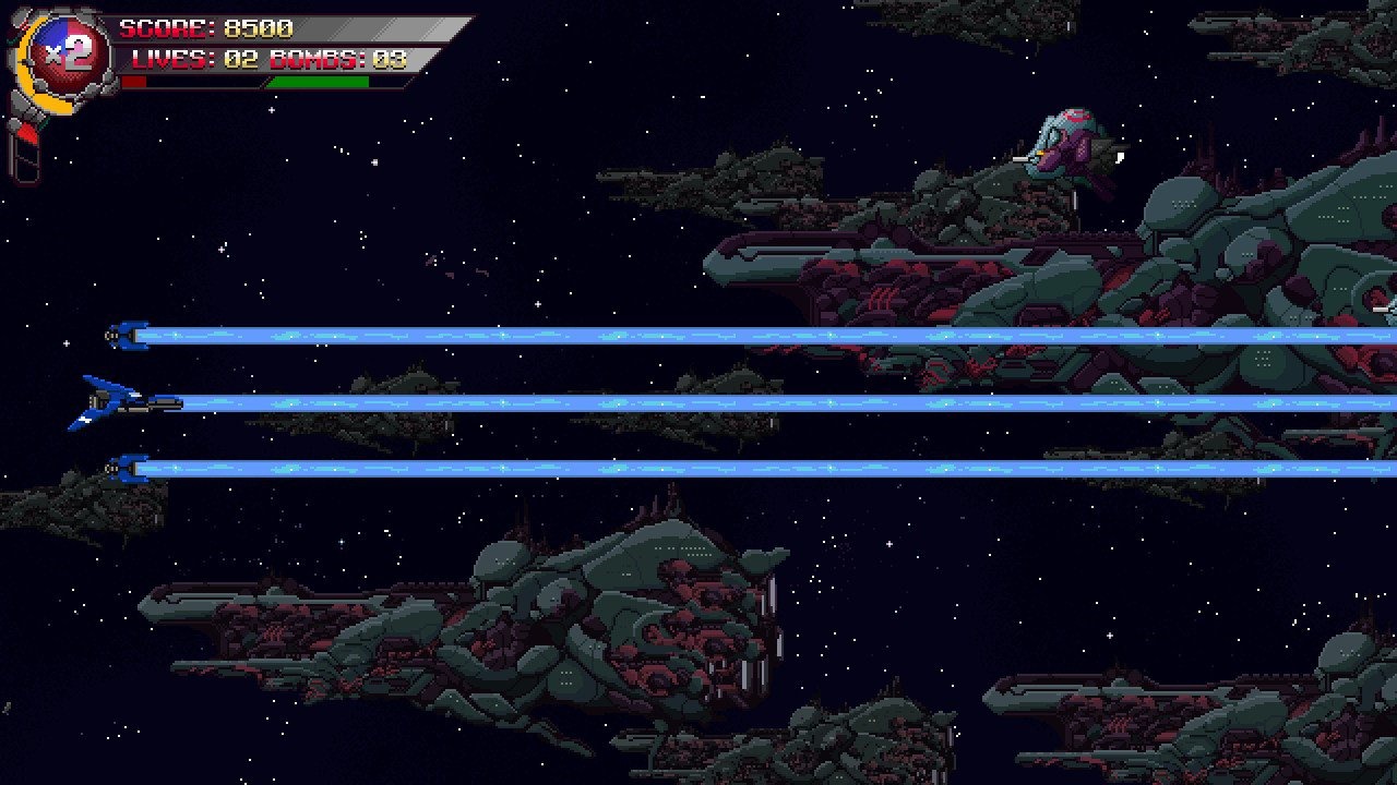Meanwhile you have ‘Bombs’, which are a misnomer. They aren’t screen clearers – instead, they increase your firepower for a short while, with the method depending on the Shot type. It summons two options that shoot lasers for Laser, and fires spread and homing missiles for Shotgun and Homing Shots respectively. Bombs are charged via destroying enemies, and so you get them much more frequently than you would in other games. It takes a long while to get used to pressing the Bomb button for extra firepower against bosses or tough enemy mobs – I kept forgetting about them initially, as I am used to games where they are scarce but keep you alive in a pinch. I wish that the Bomb count was somewhere more viewable than the top-left, however. It’s a bit hard to see currently with red and yellow font against a gray background.