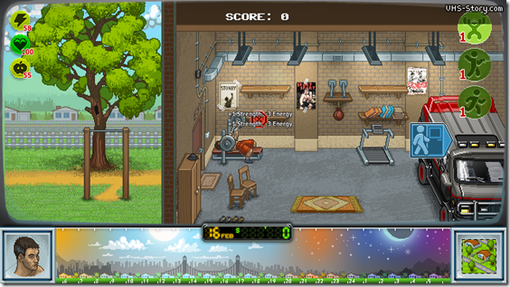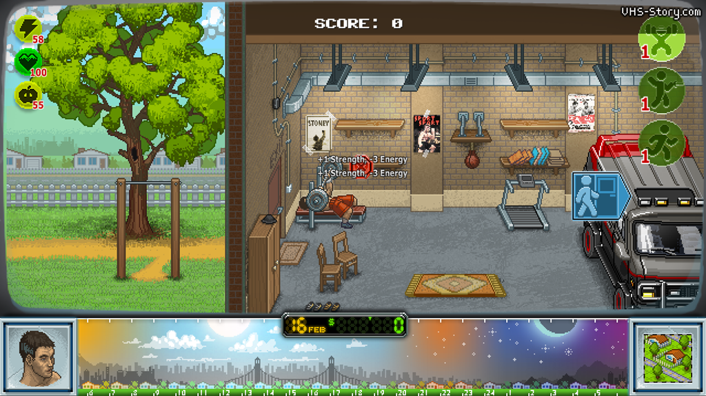VHS Story hasn’t been mentioned on Siliconera, and as its alpha version will be available shortly, it seems like a good time to give you a primer. It’s about a guy who wants to become the greatest fighter in the world. And you’re the person who’s going to hopefully make that happen. You do this by starting out as a small town underground fighter, but through training, tournaments, and managing your diet and daily routines, you can ascend to the heights of his dreams. But it’s up to you to call the shots—you can quite easily become nothing more than a couch potato.