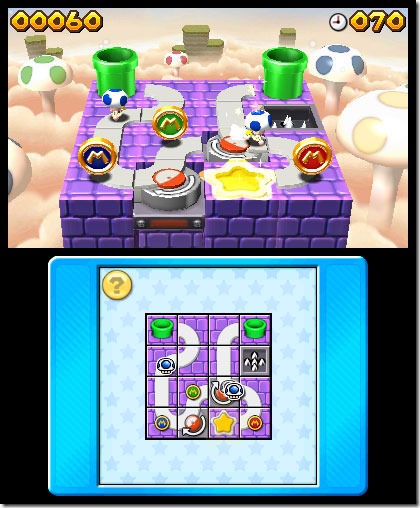The first group is Mario’s Main Event, and consists of 60 puzzles that are unlocked in groups of 10. I like to think of the first 10 puzzles here as the overall tutorial, as even though the other three groups have slightly altered rules and guidelines, the premise is similar. In this case, a map is presented with a pipe from which a Mini will appear, along with blue, red and green Mario coins, perhaps a key, and a star goal. The action takes place on the top screen, while players lay tiles on the touch screen. These invaluable tiles appear randomly in a red pipe on the touch screen, where up to five tiles can be stored at a time. The goal is to place the tiles as quickly and efficiently as possible, helping the Mini get the items and reach the goal before time runs out, the Mini gets hurt or the red pipe overflows with tiles. It’s a very tense situation, I assure you. My heart started pounding by the time the floating coins, that require a special block to reach, were introduced in level 14, and never stopped. You want to get all those coins, after all, as it’s the only way to get a star for the level and unlock extras. That said, I much preferred Puzzle Palace, the second category of puzzles that are considered the Peach levels. It’s mainly because with this cluster of Mario and Donkey Kong: Minis on the Move challenges, you can’t lose. Instead of a series of randomly descending blocks appearing in a pipe on the touch screen, players are given varying numbers of six kinds of blocks. As long as these tiles are in the right spots, you’re going to win. You don’t even have to worry about a clock ticking down. There is a timer, but it’s only checking to see how long it takes you to complete the level. I loved these challenges so much. My success wasn’t left up to chance, and I felt brilliant every time I arranged the tiles in the proper positions.
