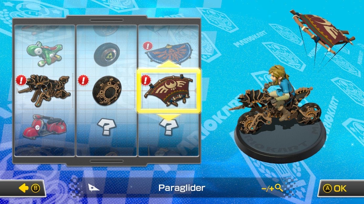 After updating Mario Kart 8 Deluxe to version 1.6.0, the new options are immediately available. Selecting Link will allow you to choose from his standard and The Legend of Zelda: Breath of the Wild costume. Under vehicle options are the Master Cycle Zero, an item that originally appeared as a reward for completing The Champions’ Ballad DLC’s EX Champions’ Ballad quest in The Legend of Zelda: Breath of the Wild. You also get Ancient Tires, Hylian Kite and Paraglider customization options.
