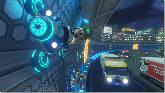You can’t depend on having a large arsenal of weapons on hand anymore, as Mario Kart 8 does away with being able to hold two items at a time. Indeed, it seems the days of trailing bananas behind you with a red shell in reserve are long gone. Instead, that item slot is full until you’ve fully parted with whatever it is you pick up in a mystery block, putting the focus on how you navigate the game’s several clever stages. You may only be stuck with one item, but you’ll rarely be stuck with just one route. For example, on the re-imagined Toad’s Turnpike course, you can use anti-gravity to scale the freeway walls, but if you choose to stick to the freeway, you can use traffic to your advantage. Trucks with surfboards propped on their back can be utilized for speed boosts, while larger ramps launch you into the air and give you the chance to glide over overpasses (and hopefully not into helicopters). You can land on top of trucks for more speed boosts, but be careful—one miscalculated drift will throw a huge stick in your spokes. Mario Kart 8 escapes the grasp of gimmick-hood not only in the modest frequency in which anti-gravity segments appear, but also in its ability to make non-anti-gravity segments just as risky. Cloudtop Cruise is a perfect example of this. Near the end of the course, you’ll be scaling a large vine (the word “bean stock” comes to mind). You’ll see two leaves hanging off the course which, if maneuvered properly, can be jumped off of in succession to gain a decisive speed boost that has often been the difference between 1st and 4th place.