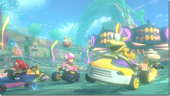 Yet, my favorite thing about Mario Kart 8’s soundtrack isn’t the music itself, but how the music is built into each of the game’s 32 race tracks. Naturally, some examples are stronger than others. Any Mario Kart fan worth his or her salt knows by now that, on the final lap, the music in any given course will pick up speed. Similarly, if you place 5th or lower, your victory theme sounds like a band of broken kazoos at a sad clown party. But that’s not the sort of implementation I’m talking about. Two examples that spring to mind are the Star Cup’s Dolphin Shoals and the Special Cup’s Cloudtop Cruise. When you take off from behind the finish line at Dolphin Shoals, you’ll be treated to the mellow beat of a steel drum while you and your opponents race underwater. When you enter a caved area with pipes, the steel drum will fade out—but then you’ll burst through the water’s surface where, apparently, all of Mario Kart 8’s alto saxes have been roaming free. Return to the water again, and the saxes transition smoothly into steel drums.