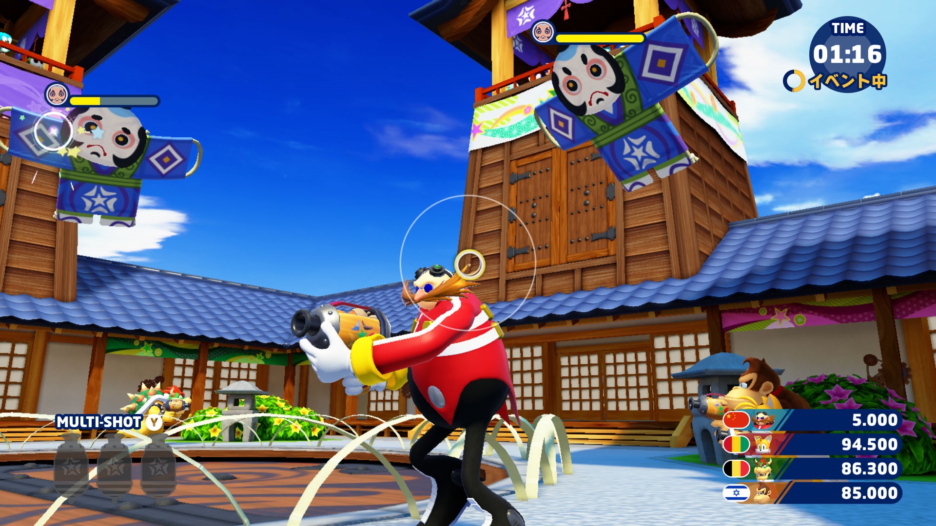 An original event where four players participate in a shooting game. You can play free-for-alls or team matches. In this event, you shoot acorn bullets at targets in order to collect points. There are many gimmicks in this house of tricks and traps. You can shoot switches to open doors and reveal hidden targets. By shooting consecutive targets, you get a combo bonus. When a giant kite appears, it’s Chance Time! You can earn many points if you manage to get the Multi-Shot item and hit the kite multiple times. Mario & Sonic at the Olympic Games Tokyo 2020 will appear on the Nintendo Switch in the Americas on November 5, 2019 and in Europe on November 8, 2019.