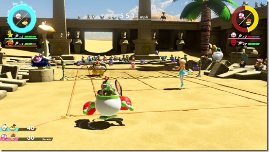 The Play Time options in Mario Tennis Aces are a little limiting too. You have Quick Play, which makes the first person to seven points the winner. (Unless a tie occurs at 6-6, since then one person has to have a two-point lead.) Extended Play makes it a little more trying, as it has a similar notion but gives the first person to win two games the win. (If it is 1-1, one person needs a two-game lead.) This is great for people who like short games! It fits with the style of a tennis game that is more about being goofy and having a Mario-spin on it than being true to the actual sport. But in real tennis simulators, you need to win six games with a lead of two games to win a set, and need to win best of three sets in women’s tennis or best of five in men’s. That extended option is not present, which some may find frustrating.