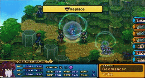 As the masters of the earth, the Geomancer has the ability to see ley points (areas of the map imbued with elemental power) as well as various positioning abilities as locking an enemy in their current position or even switching places with them. One strategy is to surround your Geomancer with three melee-type fighters and then use the Replace ability to switch places with an enemy unit, having already set up a triangle formation and being prepared for a Combination Attack as soon as the enemy "warps" into the center.