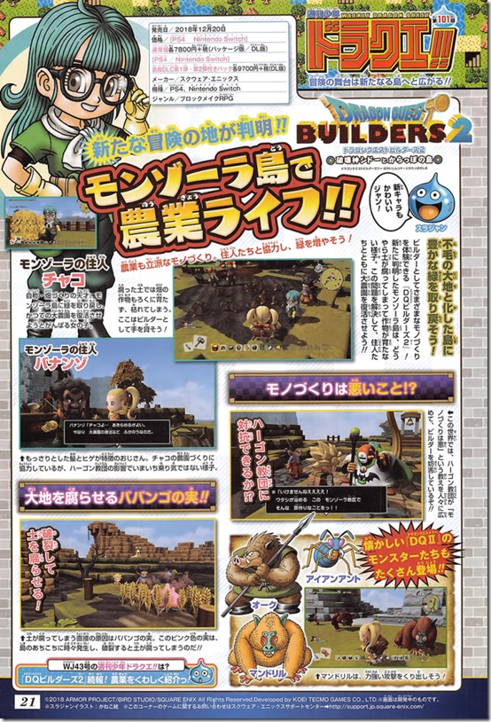 Square Enix shared new details on Dragon Quest Builders 2 in this week’s issue of Jump magazine with an introduction to new characters Chako and Bananzo of Monzala Island. In Dragon Quest Builders 2 you’ll be doing all kinds of building. Monzola Island is new area where the soil is dead and they can’t grow any crops. Your job will be to help them solve the issue and help restore the greenery with its people. Chako is a girl you meet at Monzola Island. She’s a self-proclaimed genius of crop-building, and a hard-working girl with a goal of restoring the greenery of Monzala Island. Bananzo is an old man characterized by his unfashionable hair and beard. He’s helping Chako build a farm, but hasn’t been up to the task lately due to the influence from the Hargon Order. In Dragon Quest Builders 2 you have the Hargon Order spreading their influence saying that “building is evil” and get in the way of Builders. However, before you can build anything at Monzola Island you’ll need to figure out the cause of its dead soil, which appears to have something to do with the pink Babango Fruit that occasionally grows around the island. This fruit can explode, which causes nearby soil to go bad. Lastly, we see some familiar monsters from Dragon Quest II including Orc, Badboon, and Iron Ant. Dragon Quest Builders 2 releases in Japan on December 20, 2018 for PlayStation 4 and Nintendo Switch. Check our previous report for info on other recent characters including Lulu and the Captain.