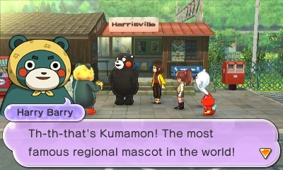One of Japan’s most famous regional mascots is in Yo-kai Watch 2. After completing a number of Harrisville quests that sees your avatar’s grandfather, Kenny, reconnecting with his Yo-kai friends, a new sidequest will appear called “Your Local Mascot.” Harry Barry, a Yo-kai that wants to be Harrisville’s mascot, will appear at the small town’s train station to kick off a back-and-forth chain that will eventually result in everyone meeting Kumamon, the mascot for Japan’s Kumamoto Prefecture.