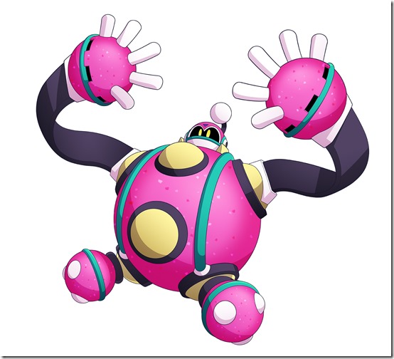 To further complicate things, bright, spherical robots Boyorn and Poyorn will tumble around, protected by a thick rubber armor that allows them to take significant damage while happily bouncing about. You might be tempted to blast them on sight, but their high resistance to damage and tendency to rebound off of everything makes it safer to leave them alone if you can help it. However you decide to tackle this stage, you’ll want to keep an eye out for solid ground to take a breather every now and then.