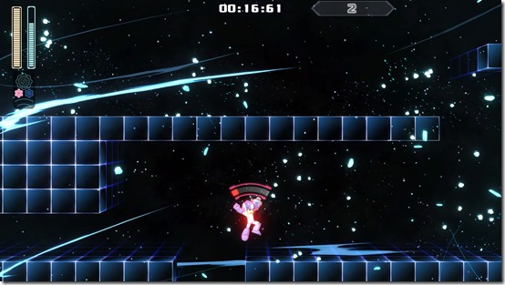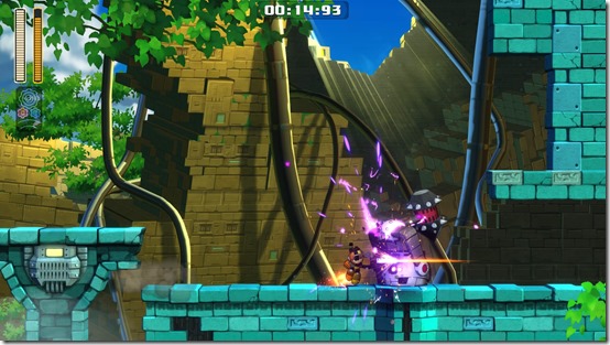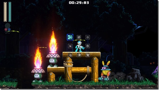 Scramble Thunder shoots two balls of thunder downwards that travel along the surface, and can also be aimed upwards. I found it especially useful taking care of enemies directly above me, or when multiple enemies were lined up along the same surface. Power Gear turns the balls of electricity larger, and makes them go through enemies instead of staying at the position of first contact with an enemy. One good idea is to shoot one Scramble Thunder, and slide behind it so that it stays on-screen and clears everything in the way. Rush Coil / Rush Jet