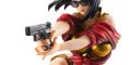 The figure set includes two 1/8 scale figures of Spike Spiegel and Faye Valentine. Both characters come with guns at the ready and feature dynamic poses. Images show Spike holding a cigarette in his mouth and Faye wearing her iconic sunglasses. Additionally, the figure set features both characters’ names printed on a brick-style figure stand. Attached is a broken glass-style plastic background that has the Cowboy Bebop logo and a silhouette of Spike’s ship, the Swordfish II. The two figures were originally released separately back in 2019. While the original releases also included a figure stand and background, the logo and Swordfish silhouette are new. You can get a better look at the figure set in the screenshots below: