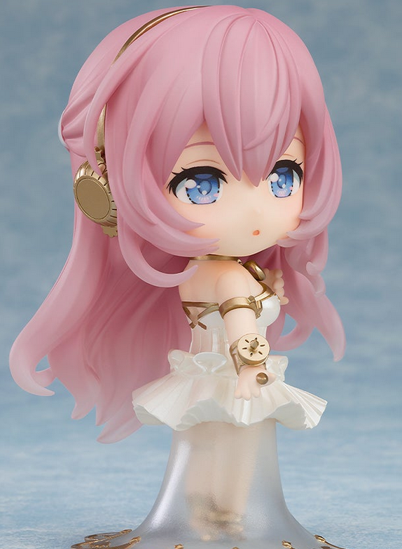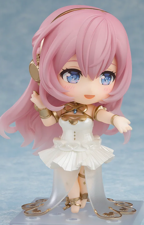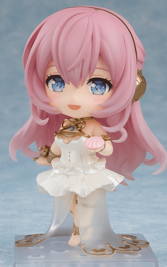 This Nendoroid uses the visual for Luka from the Hatsune Miku Symphony 2024 ~Luka 15th Anniversary~ concert. It took place in early October 2024 in Yokohama. In this visual, Luka wears a white dress that has a tutu-like cut. Underneath the dress, there’s another sheer and scalloped piece of cloth. The entire outfit has a white-and-gold color scheme. But between the bare feet and the shell in the promotional image, it seems that this outfit is meant to evoke the image of a goddess rather than formalwear.