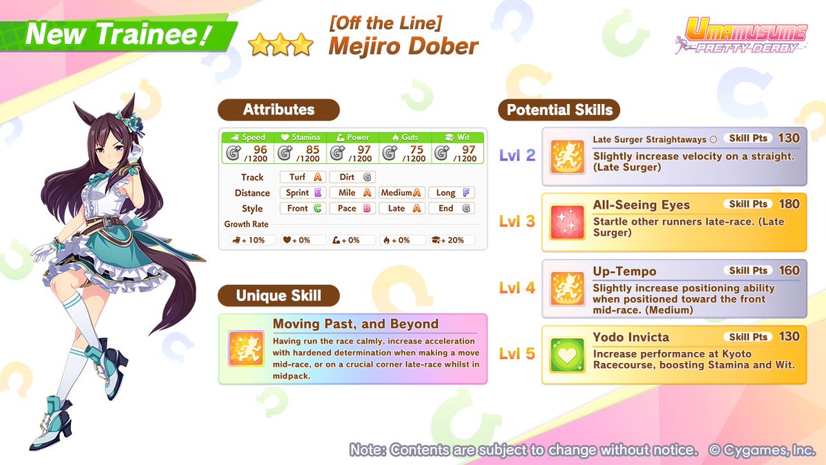 As I mentioned before, Mejiro Dober is best used as a Late Surger, due to the nature of her Unique Skill and many of her Potential Skills involving that strategy. She’s designed to excel on Mile and Medium Turf tracks, and it would be quite difficult to get her to a place to run Sprint or Long ones. She has a 10% Speed growth rate and 20% Wit one. Her Moving Past, and Beyond Unique Skill can kick in either mid-race or late-race, depending on her positioning and triggers. She can also get Late Surger Straightaways, to help with velocity on that part of the track, and All-Seeing Eyes to startle all other runners late-race if she’s being used as a Late Surger. She’s also related to Mejiro Ryan and Mejiro McQueen, which can help with inheritances and buffs in Career.