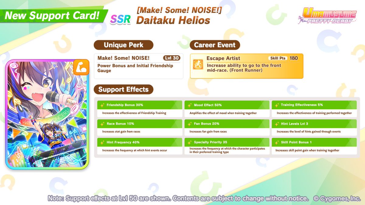 As for the SSR Daitaku Helios Power card, it might be best for Front Runners. The Career Event can net someone Escape Artist, just like the SSR Seiun Sky Stamina card. She also has a level 30 Unique Perk that increases her initial Friendship gauge and grants a Power bonus. She also has Specialty Priority 35, to ensure she’ll be at Power for training in Career.