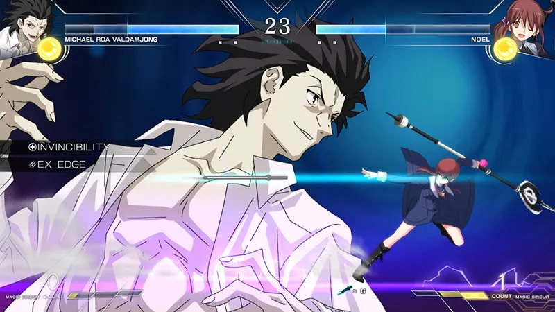 Another Melty Blood Type Lumina competitor’s been revealed, and it is Michael Roa Valdamjong. He’s a familiar face, as he debuted in the fighter back in Melty Blood Actress Again. Though in terms of Tsukihime proper, people wouldn’t encounter him unless they ended up on a Near-Side Moon route. As in past games, Michael will be using fast attacks in Melty Blood Type Lumina. He’ll also still have the power of lightning on his side. Here’s the official trailer showing Michael fighting Arcueid in Melty Blood Type Lumina. You can see some of his different attacks in action as he fights her. He racks up quite a few combos. You can also see how he can quickly get behind an opponent and out of their reach to use one of his lightning-based abilities. Things wrap up with his big finale, which comes in at the 35 second mark of the video below. And here are some screenshots showing off his different attacks.
