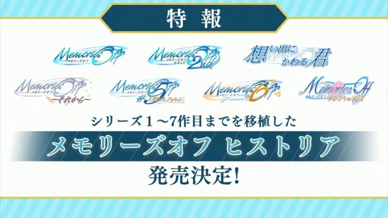 Earlier today during the 20th Anniversary livestream celebrating the Memories Off series, Mages. announced a new collection of the past seven titles in the series, titled Memories Off Historia. (Thanks, Game’s Talk!) Essentially, the collection contains every main title before Memories Off – Innocent Fille-, which acts as the final title in the series. Note that there are several direct sequels and spin-offs for some of the titles, but these will not be included in Historia. The included titles are: