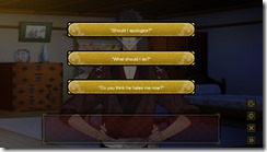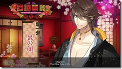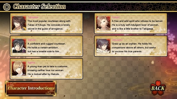 Like the original The Men of Yoshiwara, the Ohgiya installment also takes place on an island where women come to visit male courtisans. Players follow Kiyoha, a young woman and clothier who ends up meeting and interacting with five men working and living at the Ohgiya house. The romanceable bachelors include the popular Takigawa, ambitious Gakuto, wild Asagiri, orphaned Utsusemi, and novice Ageha. This is one of those otome visual novels where you pick your bachelor at the start of the story and are locked into his route.