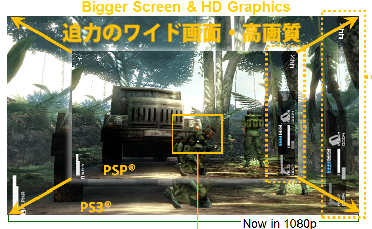 Metal Gear Solid: Peace Walker HD Edition will be released as a separate game in Japan. That’s a picture detailing how the game looks compared to the PSP version. The PlayStation 3 package includes a code to download Metal Gear Solid: Peace Walker for your PSP, so you can make use of the transfarring (save data transferring) feature. The Xbox 360 version gets… another avatar item.