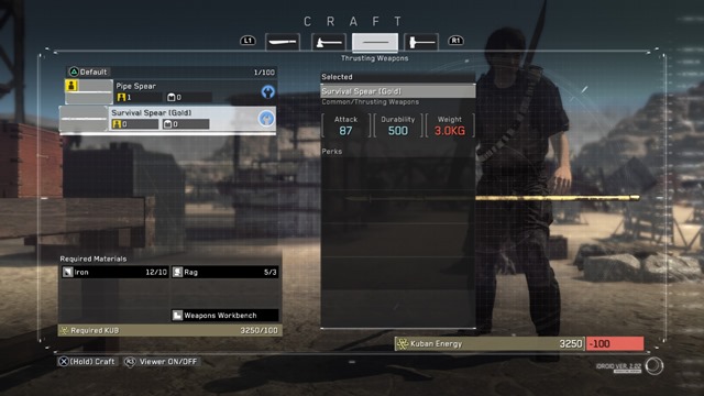 Another important factor is repairing and upgrading. As you use your weapons and equipment, they will degrade. They will also become obsolete. I would say after every mission, upon returning to base, it is a good idea to double check your primary weapon and additional supplies. You want to always be ready, in the event the next mission or side-quest ends up being more difficult than you might expect. Plus, it is good form to have a routine in Metal Gear Survive. Immediately getting more food and water in you upon returning, then checking your current equipment at the crafting stations, before striking out again or planning your next move is just smart.
