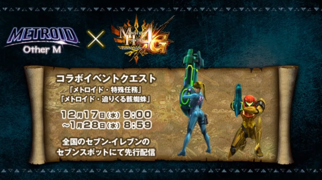 Similar to the other collaborations, the one with Metroid: Other M will feature quests that will allow you to gather materials to make Samus’ Power Suit and Zero Suit, along with a Bowgun weapon that looks like her Arm Cannon. By collecting all the pieces of the set, they will make some sounds you might be familiar with from the Metroid series. The collaboration will run from December 17th, 2014 – January 28th, 2015. It will be available via 7-Eleven stores throughout Japan.