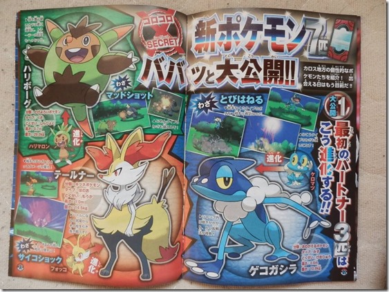 Additionally, CoroCoro also reveals the evolved forms of the three starters in Pokémon X and Pokémon Y—Chespin, Fennekin and Froakie. Take a look at their evolved forms above. Pokémon X and Pokémon Y will be available worldwide on October 12th.