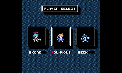 While I first looked at Azure Striker Gunvolt and thought “this looks like a lot like Mega Man,” my first look at Mighty Gunvolt made me think “this is undeniably Mega Man”. The retro-style visuals, the tight controls, and familiar mechanics all seemed to be here. That said, like Azure Striker Gunvolt, an initial glance at Mighty Gunvolt won’t tell you the full story. Perhaps the quirkiest aspect of Mighty Gunvolt comes from its collaborative nature between three different series Inti Creates has worked on: Mighty No. 9, Azure Striker Gunvolt and… Galgun. While Mighty Gunvolt bills itself as a crossover between three franchises, in general it feels more like an 8-bit remake of Azure Striker Gunvolt. Four out of the five stages in the game come from Azure Striker Gunvolt, with the remaining one dedicated to Galgun. Sure, Mighty No. 9 isn’t out yet, but I can’t help but be a little disappointed at that level distribution. That being said, I really like the concept of taking ideas from Azure Striker Gunvolt and presenting them in a more traditional, mechanically simpler way. If anything, this game is actually a crossover between styles of platformers. Mighty Gunvolt looks and feels a lot like playing the NES-era Mega Man games, but many of Azure Striker Gunvolt’s unique enemies, bosses, and stage hazards are carried over and transition surprisingly well into the dramatically different environment. Mighty Gunvolt also attempts to bridge the old and new style of games with its characters. Beck, Gunvolt, and Ekoro all take gameplay elements from their respective games to inject some new spice into the classic 8-bit platformer formula.