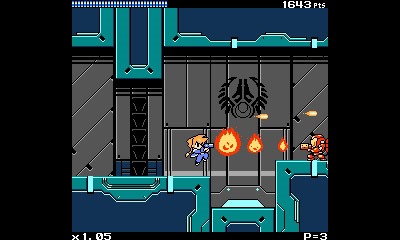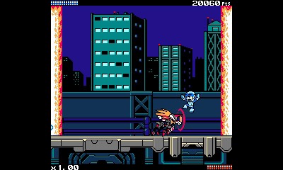 Ekoro seems to be the most technical character in the cast, relying on the ability to charm enemies onto your side by hitting them with a charged shot. After you’ve entranced an enemy, it will fire bullets at other enemies for you until it gets destroyed, either by taking damage or by crashing into enemies by your own command. Ekoro’s mobility relies on the ability to fly, making it a middle ground between Beck’s dash and Gunvolt’s double jump. The most apparent fusion between older and newer generations of gameplay comes from the level design. To put it simply, Mighty Gunvolt does for the NES Mega Man games what Azure Striker Gunvolt does for the Zero and ZX games. At a glance, levels feel consistent with an NES platformer, but a closer look reveals that the game also serves the same basis for score-focused gameplay that Azure Striker Gunvolt does. Often, levels have paths meant purely for collecting score-increasing items, with some characters being able to access exclusive areas based on their mobility. Additionally, the combo system from Azure Striker Gunvolt returns, where the more enemies you kill without taking damage the more points you obtain.