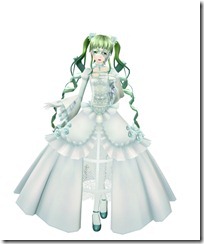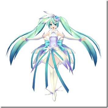 The song, “Cantarella,” has both Kaito and Miku, and Miku’s module is called Rose Bianca. This dress module is pretty rare, since it’s a full-length and full-skirted dress all a-flutter with lace compared to other modules which rarely feature a dress. The masked version makes her look so much more refined and sophisticated, it’s almost like a different person.