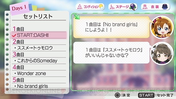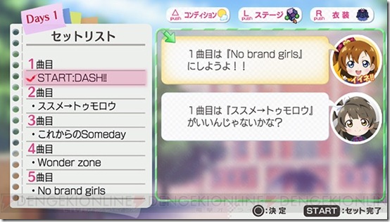 That said, we still have very few details on Printemps. While we know you’ll be helping to organize the idol band μ, teaser screenshots from Dengeki do suggest that there’s going to be a pretty deep integration between the game’s rhythm modes and what you do beforehand. The Days Setlist picture, for example, shows two of the girls suggesting which songs they should open a concert with, such as “From This Day Forth’s Someday” or “No Brand Girls”. Whether you choose to take them up on it could possibly affect the idols. You don’t want to see an upset super-deformed face cute girl cry do you? I sure don’t, but which will you choose? Love Live! School Idol Paradise Vol. 1 Printemps is scheduled for a May 29 2014 release on the Vita.