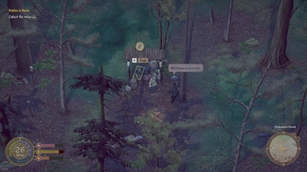 And it’s here the art style actually starts to hurt the game. While it does bring a distinct, almost storybook-style aesthetic that reminds me of Wildermyth, it also makes the game world appear very flat which makes it difficult to judge distances for attacks and dodges. Combine that with a fairly close player camera, and the environment ends up feeling quite same-y and indistinct, as one small copse of trees blends into another when there’s no roads or buildings to orient yourself around.