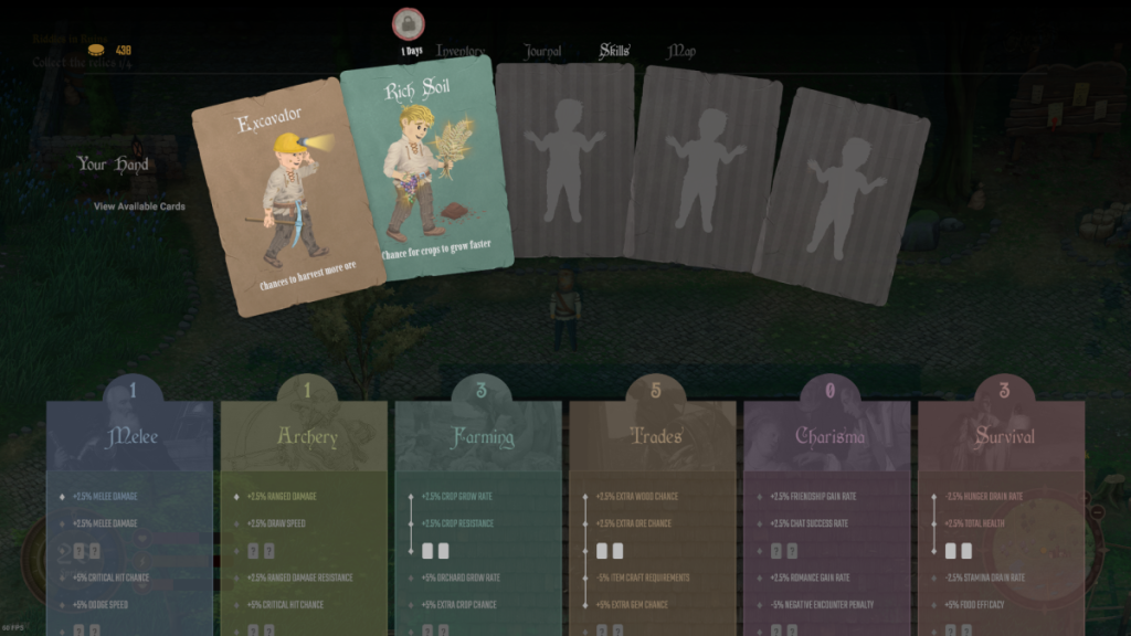 Whatever you turn your hand to, you’ll end up earning experience in a relevant skill where you’ll eventually get equippable skill cards. Each card grants a bonus like a chance for extra resources or a slowed rate of hunger but you can only have a few at a time and it takes a day to swap them back again. It’s actually kind of a nice system that lets you tailor your perks to whatever you feel like doing on a given day.