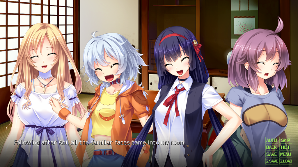 Each of the four women shows aspects of their animal in their personalities. Tsubaki, the cat, shows determination in getting what she wants. Aoi, the dog, has boundless energy and a desire to please. Nazuna, the tanuki, can be a bit of a troublemaker. Sumire, the fox, has a caring instinct and desire for contact. There is more to each of these characters that players can find out, though, by decisions they make and who they spend their time with as they head to hot springs, festivals, and picnics together (and possibly run into some Gods).