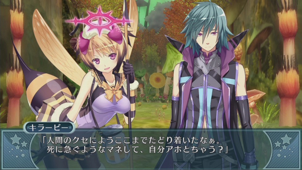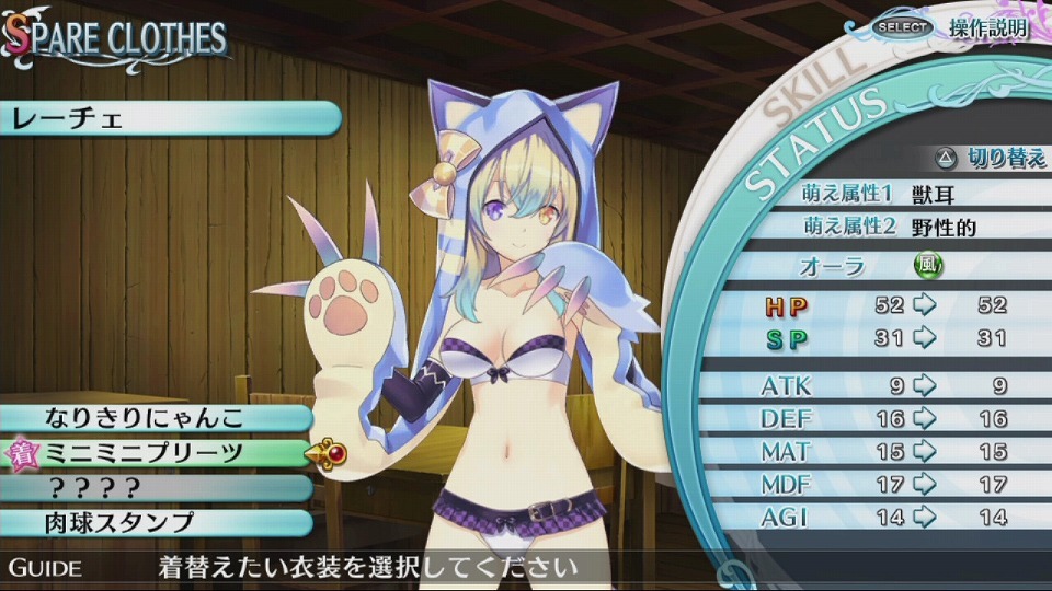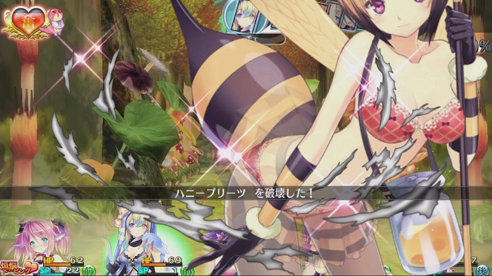 At 3:33 in the video, Io and the girls encounter the Killer Bee, the bee-type monster girl. As you destroy a monster girl’s clothing, you’ll be able to flatter them with Io in the middle of battle. Once you max that out, you’ll be prompted to participate in a special rubbing feature, where you’ll have to press certain parts of the girl on the PlayStation Vita screen. If you can manage to find her “sweet spot,” she’ll fall for you and will become a new ally, after a special scene. Instead of hats or weapons, Moero Chronicle uses panties for changing job classes for the girls, which changes their stats and attributes to go with a different look. Panties can be given to them as presents, which also increases your relationship parameters with them.