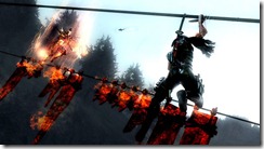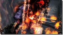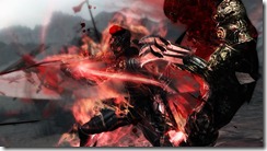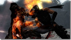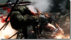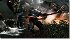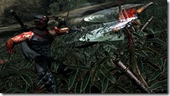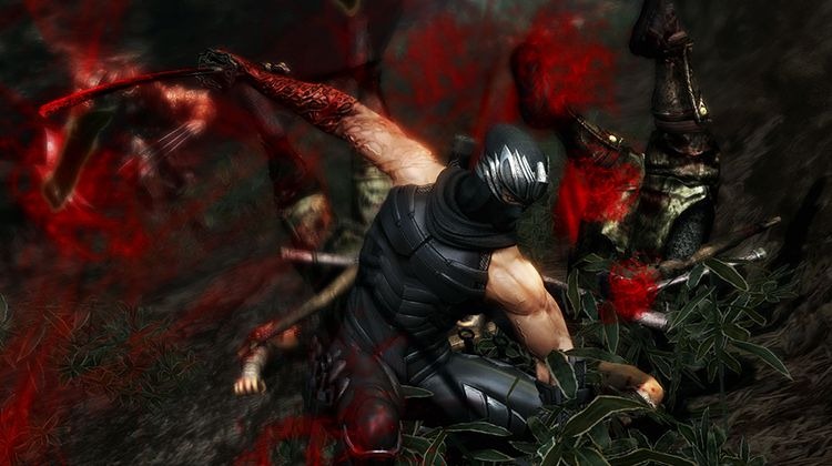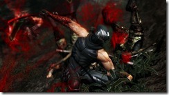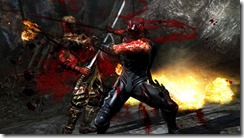This is an action-adventure game in which players assume the role of Ryu Hayabusa, a cursed ninja battling a terrorist organization. Players use katanas, machine guns, explosives, and special attacks to kill demon creatures and human enemies (e.g., evil ninjas, armored soldiers). The melee-style combat is highlighted by slow-motion effects and exaggerated splashes of blood as enemies are frequently impaled, decapitated, and dismembered; some attacks end with close-up camera angles on bloodied foes. Cutscenes contain more intense acts of violence: men getting stabbed as they beg for their lives (e.g., “Listen, I’m just trying to feed my kid! Please!”); enemies screaming in pain as they are engulfed in flames. In one mode, players can use a knife to commit hara-kiri (i.e., ritual suicide). During the course of the game, some female characters are dressed in skin-tight outfits that accentuate their exaggerated cleavage; one statue-like goddess is depicted in a similar manner. The words “f**k” and “sh*t” can be heard in the dialogue.