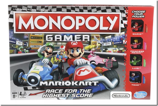 Like the first Monopoly Gamer, this is a variation on standard Monopoly with different rules and features. For example, the Mario, Luigi, Princess Peach and Toad tokens each have their own special abilities, with Bowser, Donkey Kong, Metal Mario, Rosalina, Shy Guy and Yoshi Power Packs sold later separately. You collect coins, instead of cash, as the property-buying currency. Each turn, you roll a Move die and Power-Up die to see what special item you “used” that turn. And, when people pass Go, a Grand Prix is held with people able to pay entrance fees to “race” by rolling a die to see where you placed and what you won.