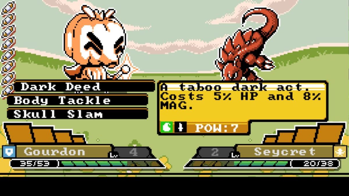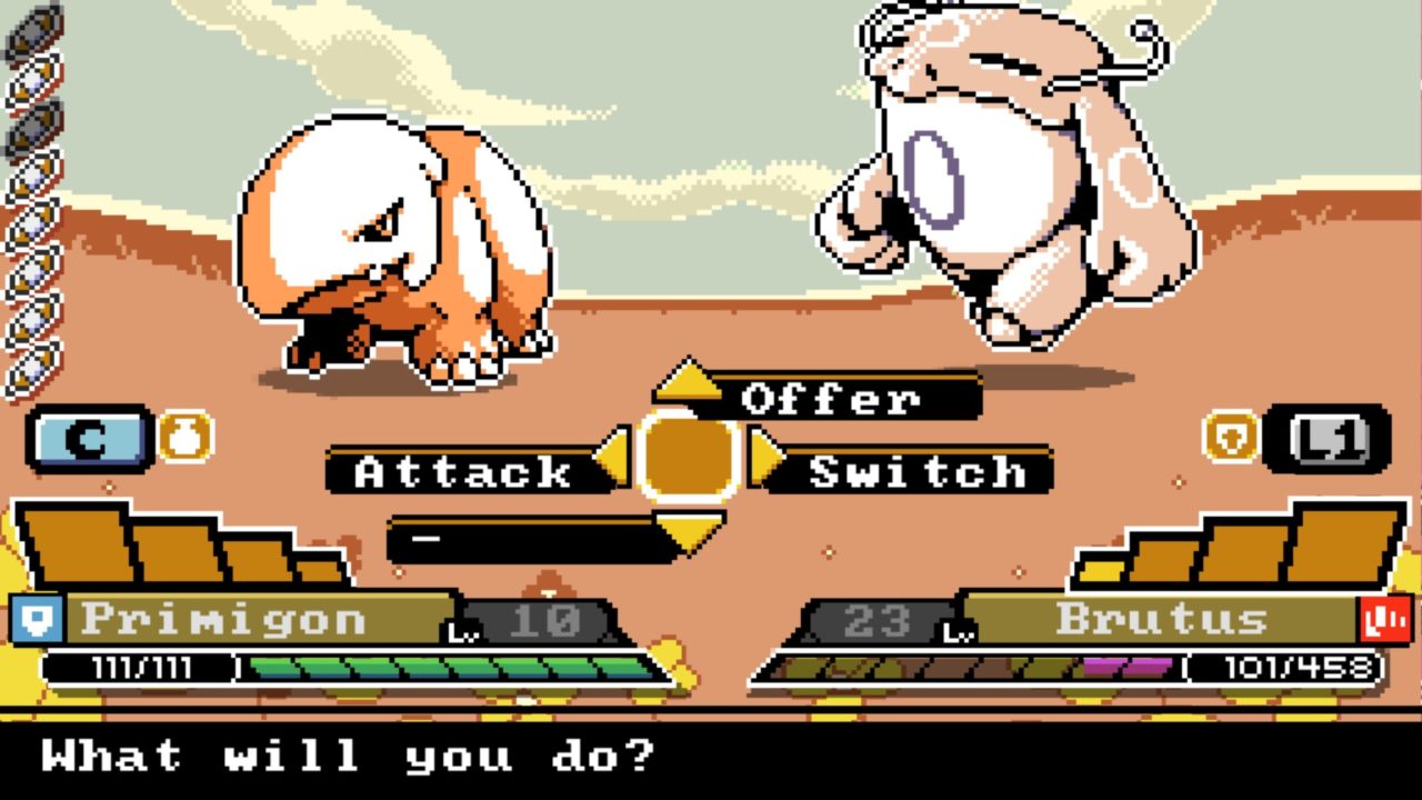 It is, at times, a breath of fresh air after the oppressive hand-holding of Pokémon. Sometimes, it goes a step or two beyond what was needed, like its typing system that isn’t particularly intuitive. There are only five types, so you can memorize them! But the types, based around personality rather than element, don’t have the obvious “fire burns grass” sort of connections and the colors and icons don’t exactly do a lot to make things easier. The result is a game you really need to wrangle. Its custom button prompts are disorienting for a while. There’s a whole button dedicated to making a monster sit so you can grab a snack and feed it. Battles are designed to have a built-in momentum, and it feels like, for once, the AI has a better handle on how to fight than you do. On the other hand, losing your items when you faint? It’s a change that leads to less of a hoarder mentality, even with the unfriendliness of the world. The aesthetics of Monster Crown split the difference between the Game Boy Color and Game Boy Advance eras. The basic menus and color palettes feel more of the earlier era, but the environments have more detail and attention. As you’d expect, it’s the sort of look that is designed for smaller screens. We played a lot on a larger TV, and in this context its issues are more glaring. The idea that the game’s “widescreen GBC” look came from looking at a PlayStation Vita tracks, and Monster Crown will be a more enticing proposition if it lands on a handheld.