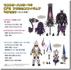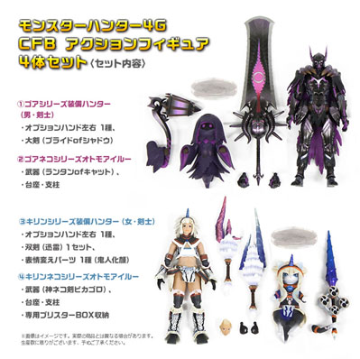 It includes four action figures featuring a male Hunter decked out in Gore Magala gear and his Felyne, along with a Kirin geared female Hunter and her Felyne companion. Each figure also includes their respective weapons, as well.