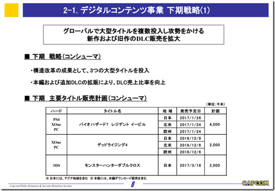 New information from a Japanese press release has revealed the first title (4 million) as Resident Evil 7, the second title (2 million) as Dead Rising 4, and the new Monster Hunter game expected to sell in the 2 million unit-range as the recently announced Monster Hunter XX. Monster Hunter Generations is currently available for Nintendo 3DS. Monster Hunter XX releases in Japan on March 18, 2017 for 3DS.