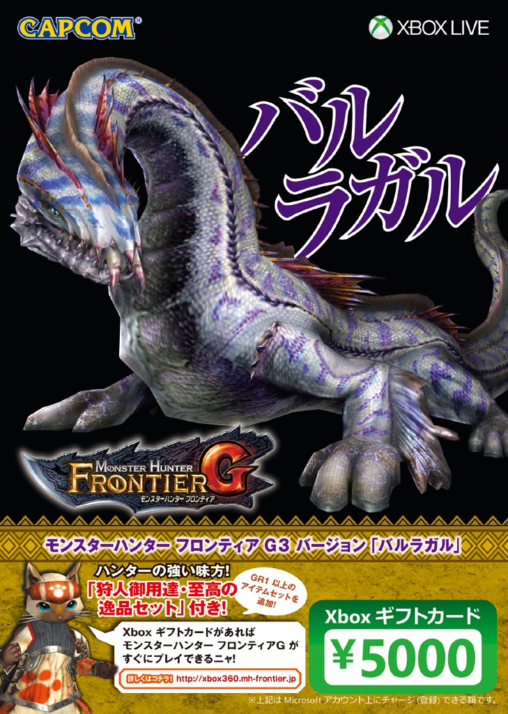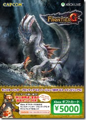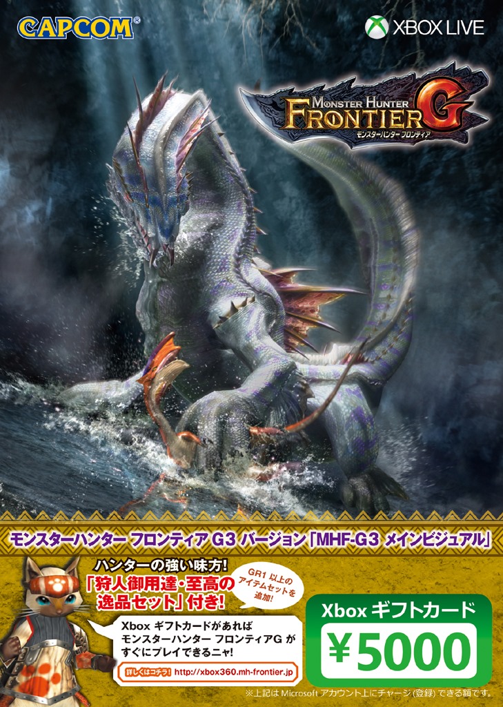Microsoft also has Monster Hunter Frontier G3 Version gift Xbox Live cards that include a code for an in-game event. Each one costs 5,000 yen ($50) and can be redeemed for 5,000 yen on Xbox Live.