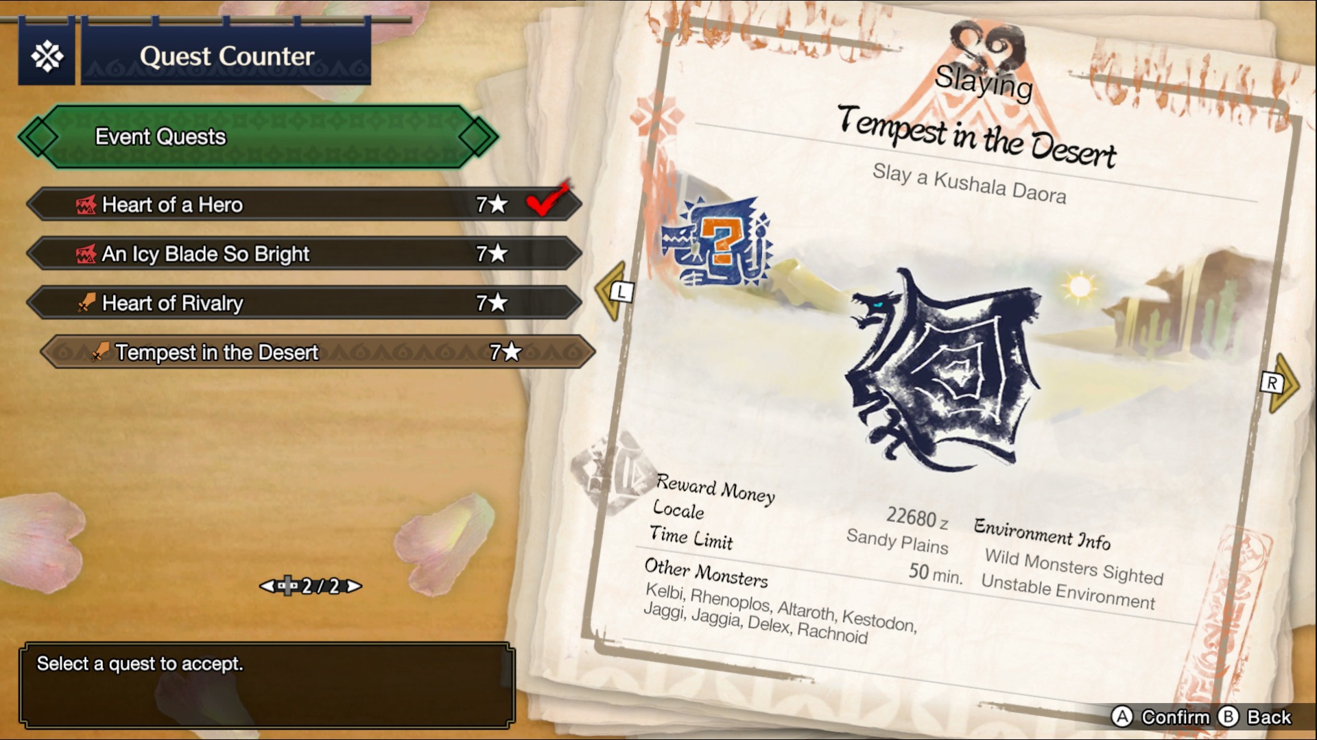 Capcom has added a new Kushala Daora event quest to Monster Hunter Rise, in addition to a new guild item provisions pack filled with upgrade materials and goods. Unlike past event quests, there are no special cosmetic rewards for the Kushala event quest. Both add-ons are immediately available via Senri the Mailman. The event quest is titled “Tempest in the Desert.” As the name suggests, players will have to slay a Kushala Daora in the Sandy Plains. Similar to most elder dragon hunts, players must be above Hunter Rank 8 to take on the quest. Following last week’s Apex Mizutsune and Zinogre hunt, this week’s event quest marks the first time that a weekly event quest has not given players some kind of reward. As with past add-ons, players can download the quest at any level by visiting Senri the Mailman in the Steelworks Area of Kamura village. Additionally, players can also download a new “Guild Provisions 2” pack starting August 20, 2021. This pack will include several armor spheres for upgrading equipment, as well as Steel Eggs for selling, and Dango Tickets. Below is a list of all the items included: