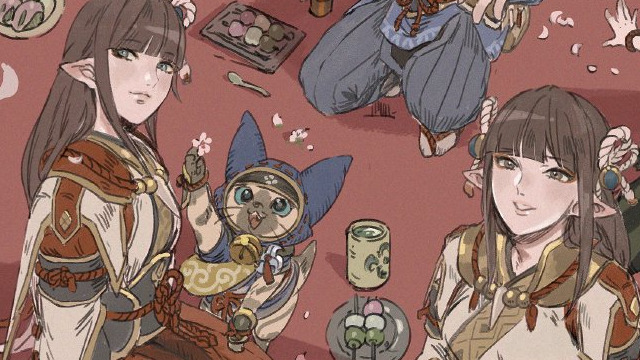 Capcom has released more Monster Hunter Rise concept art images, both of which feature Hinoa and Minoto. Previous concept art had revealed various information regarding the conceptualization of monsters like the Tetranadon and Magnamalo. However, this series of images focus on the community of Kamura Village and feature a handful of major NPCs the player encounters during the story. The first piece of concept art features Minoto. She looks up at the falling cherry blossoms while holding a Palico. A Palamute sits beside her. The second piece of Monster Hunter Rise concept art features both Hinoa and Minoto. This time, Master Utsushi, Iori, and Yomogi have joined them. You can see the group enjoying a light meal of dango beneath cherry blossom trees.