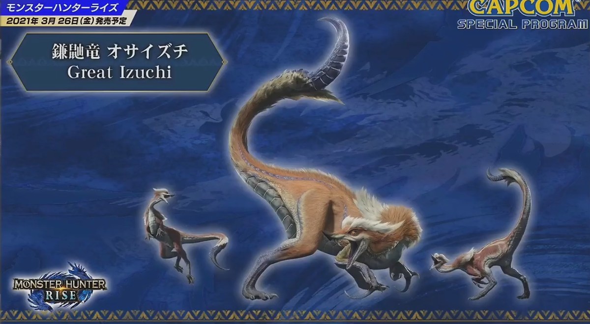 The Great Izuchi seems similar to the Great Jaggi. It’s also a bird wyvern that can create and hunt with a pack of smaller Izuchis. It attacks with its tail, which is in the shape of a scythe.