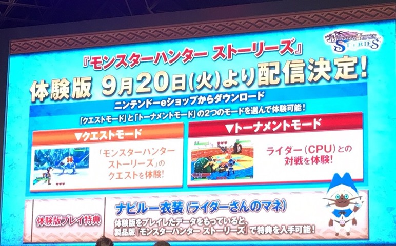 Capcom announced at Tokyo Game Show 2016 that Monster Hunter Stories is getting a demo in Japan on September 20, for Nintendo 3DS.