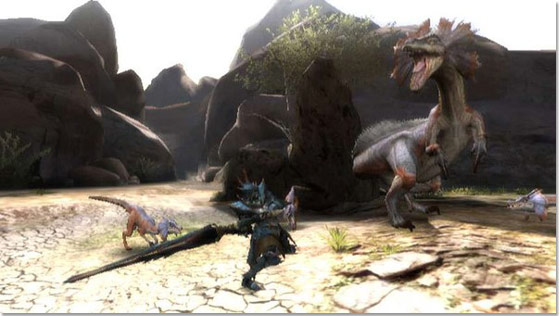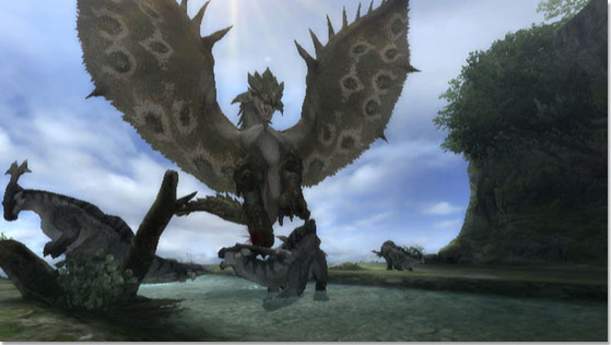 Or a higher chance of victory, rather. For you see, Monster Hunter Tri operates on what Capcom say is a virtual ecosystem. Creatures in the game act independently of one another, although, they are very much capable of influencing each other’s behaviour. The Great Jaggi, for instance, can rally his lesser Jaggis against you. And the lesser Jaggis’s only instinct is to protect the leader of their pack, with no regard for their own safety. Another important factor is where you fight your target. Depending on your class and the creature you’re hunting, an open or closed or small or large surrounding environment makes a great difference.