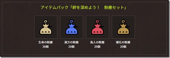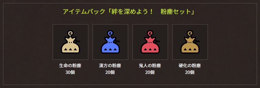 Starting today, all players will receive the “Play Together! Powder Gift Set” as part of a Twitter campaign commemorating a recent Monster Hunter: World tournament in Sendai. The pack includes the following: