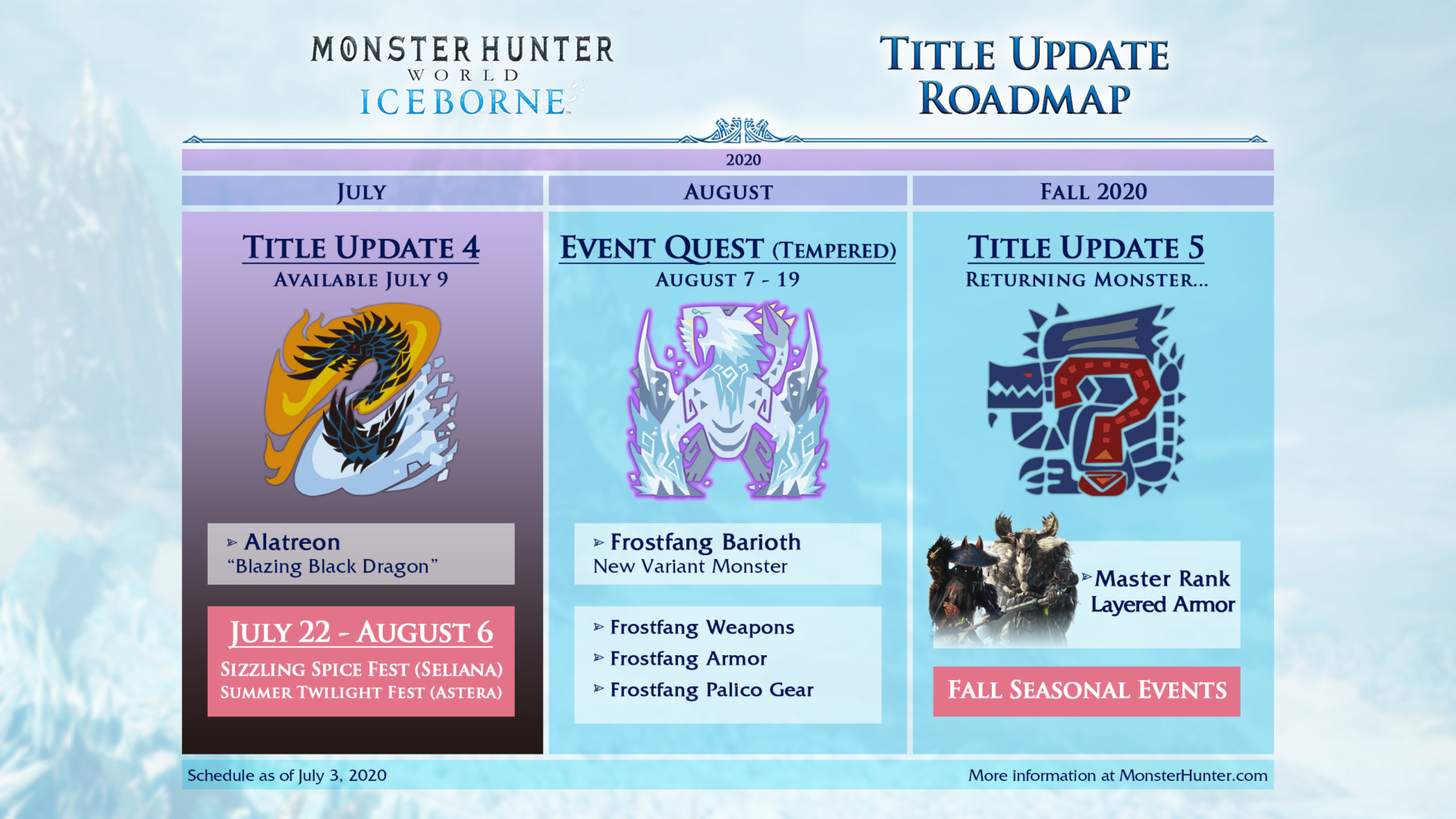 The Monster Hunter World: Iceborne Title Update 4 will be available for free starting July 8, 2020 at 5:00 pm PDT. That’s July 9, 2020 at 00:00 UTC and 1:00 am BST. The Title Update #5 will launch in Fall 2020. It will feature another returning monster with new Master Rank Layered Armor, and more. Monster Hunter World: Iceborne is available for the PlayStation 4, Xbox One, and PC.