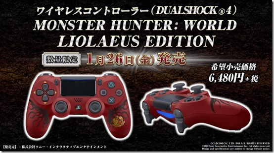 A Monster Hunter: World Rathalos Edition DualShock 4 controller will also be available in limited quantities for 6,480 yen on January 26.