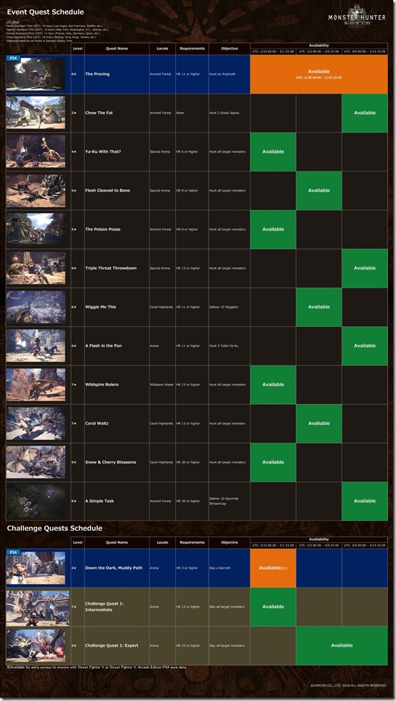 Additionally, the 2* Quest ‘Chewing the Fat’, where the hunter needs to fight 2 Great Jagras, will be re-appearing in the same period. You can view the full updated list of event quests below: