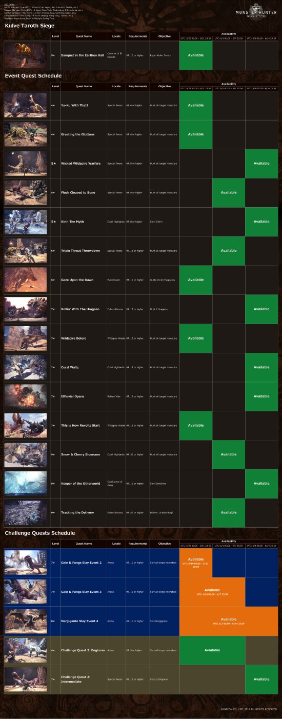 The item pack will be available to claim until May 31, 2018. As for the updated Event Quest Schedule, the main attraction that kicked off today is the return of “Banquet in the Earthen Hall,” or the Kulve Taroth Siege. 9★ Quest – Banquest in the Earthen Hall